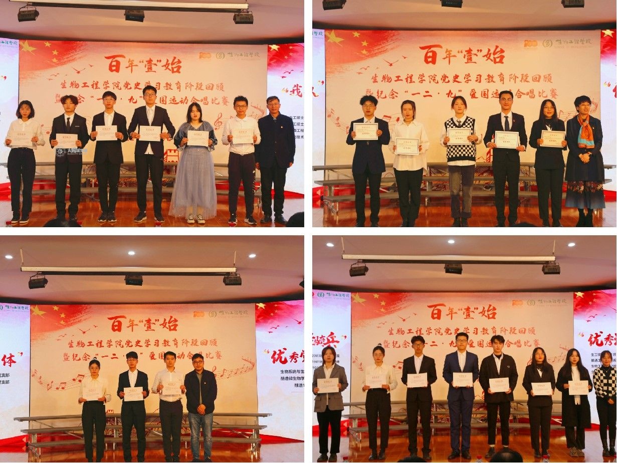 经过激烈的角逐,生物一班合唱团荣获一等奖;生工三班联合研究生、生物二班合唱团荣获二等奖;酿酒二班、生工二班、生工一班合唱团荣获三等奖;基地一班、酿酒一班、基地二班、“茅台班”合唱团荣获优秀奖。“聚生工星火,谱百年华章。”在新形势下,学院将继承和弘扬民族精神,持续推进党史学习教育,从胸怀国之大者角度增强政治自觉,增强育人担当。