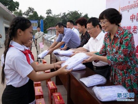2019年11月8日,中国中铁中老铁路建设指挥部副指挥长马玉蓉(右一)在老挝万象与当地小学开展文化交流活动。