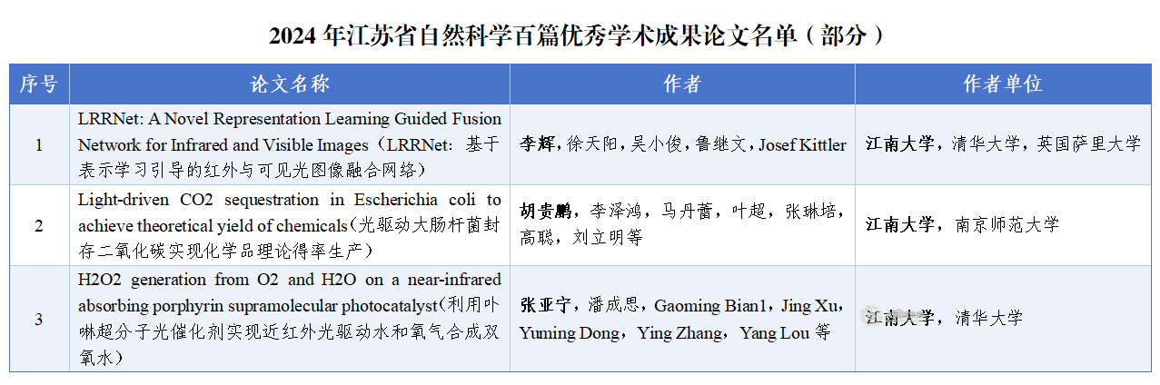 日前,2024年江苏省自然科学百篇优秀学术成果论文推选结果正式公布,我校吴小俊教授团队、刘立明教授团队和潘成思—朱永法教授团队分别指导学生发表的专业学术论文入选“2024年江苏省自然科学百篇优秀学术成果论文”。其中,人工智能与计算机学院博士生李辉、生物工程学院博士生胡贵鹏和化学与材料工程学院博士生张亚宁分别为论文第一作者。