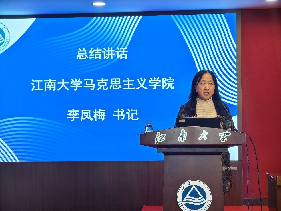 马克思主义学院李凤梅书记对上半场导师学校做总结讲话,她提出研究生导师要努力完成立德树人根本任务,坚守高校教育主阵地,努力提高自身素质,让教育家精神成为自觉追求,努力提高干事创业本领,为实现强国建设民族复兴贡献力量。