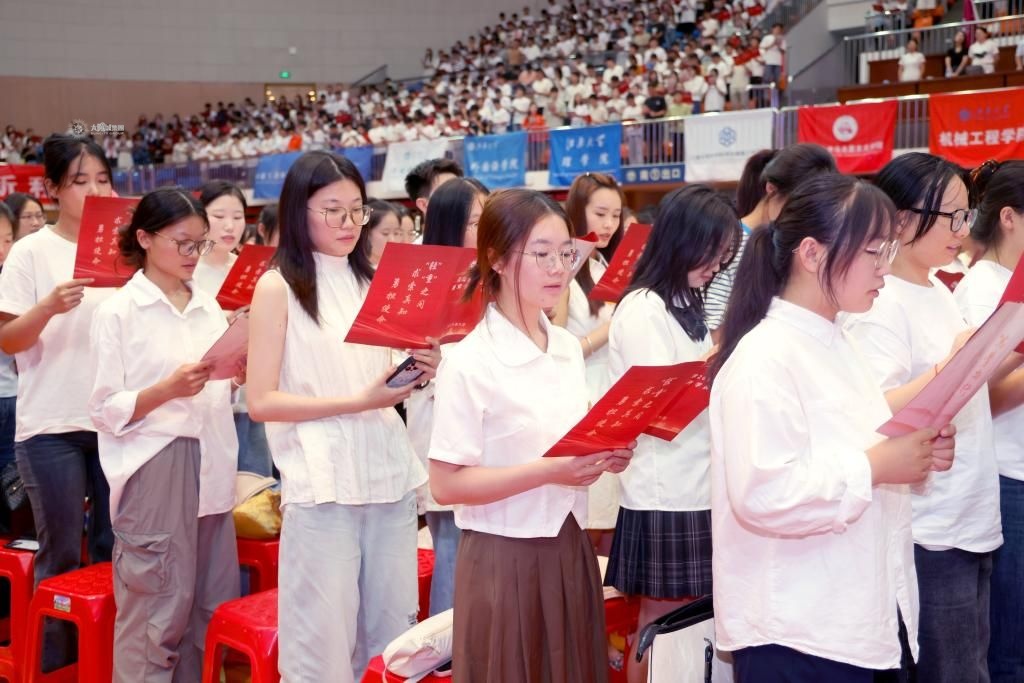 各学院新生代表接受校领导们授予的“太阳城人”丝带,全体新生起立佩戴太阳城大学校徽,唱响校歌,铭记校训,谱写青春,标志着2025级研究生正式成为“天下太阳城人”的一员,共同肩负起传承与弘扬太阳城精神的责任和使命。
