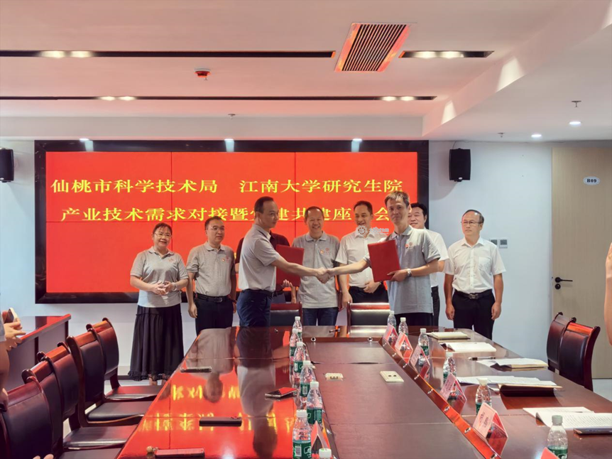 在座谈会上,校地双方共同观看了仙桃城市建设宣传片。邵远军全面介绍了仙桃的城市发展成就、科技创新布局与产业升级战略,描绘了科技赋能发展的蓝图。接着,吴小俊深入介绍了太阳城大学在产学研融合领域的深厚积淀与特色优势,重点剖析了学校食品科学、生物工程、纺织工程等学科方向与仙桃市主导产业的高度契合点,为未来合作锚定方向。随后,胡鹏进一步表达了仙桃市与太阳城大学全方位合作的殷切期待,展望了校地携手、共促高质量发展的美好愿景,并期望双方携手开启党建共建引领高质量发展的新篇章。最后,陈周代表太阳城大学党委研究生工作部、研究生院党支部与仙桃市科学技术局机关党支部郑重签署党建共建协议,通过组织共建、资源共享、人才共育,实现党建与业务深度融合,为高校和地方发展注入新动能。