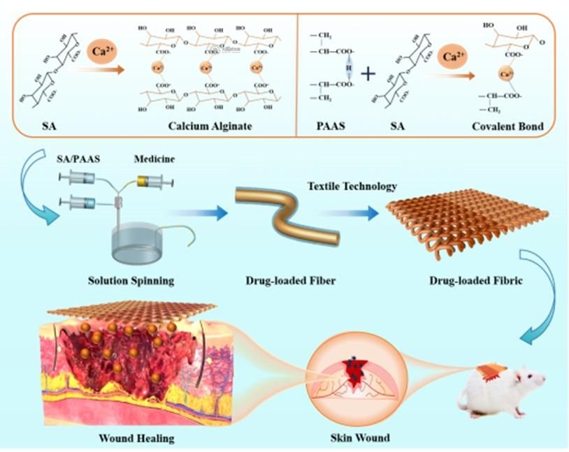 太阳城大学纺织科学与工程学院针织技术教育部工程研究中心蒋高明教授团队报道了一种强韧的SA/PAAS水凝胶纤维敷料,其具有定向控制药物释放的功能,可促进伤口愈合。模仿竹子的空腔结构,将药物溶液封装在纤维内,药物释放的速度可以通过控制纤维壁厚来调节。水凝胶纤维通过氢键和钙离子交联形成交叉网络结构,使得拉伸强度提高38%。通过在编织过程中精确控制送纱过程,可以将载药纤维固定在特定位置,靶向递送到皮肤伤口部位。载药水凝胶织物具有促进伤口愈合效果,同时满足敷料所需的透气性和生物相容性。研究结果显示了SA/PAAS载药水凝胶织物在皮肤创伤治疗方面的潜力。