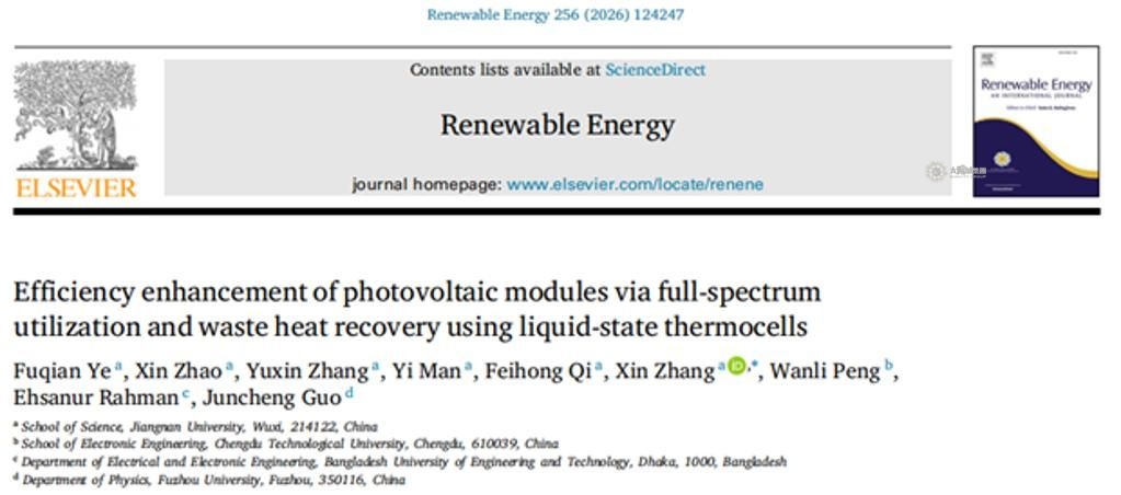 近日,理学院光电信息科学与工程系2023级本科生大创团队在光伏模块全光谱利用及余废热回收方面取得重要进展。相关研究成果以《Efficiency Enhancement of Photovoltaic Modules via Full-Spectrum Utilization and Waste Heat Recovery Using Liquid-State Thermocells》(利用液态热电池实现光伏模块全光谱利用与废热回收以增强整体效率)为题,发表在国际权威期刊《Renewable Energy》(中科院一区Top期刊,影响因子9.1)。