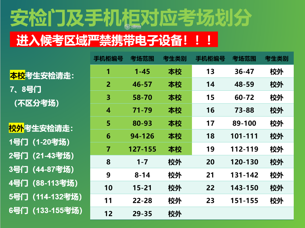 安检门及手机柜对应考场划分情况