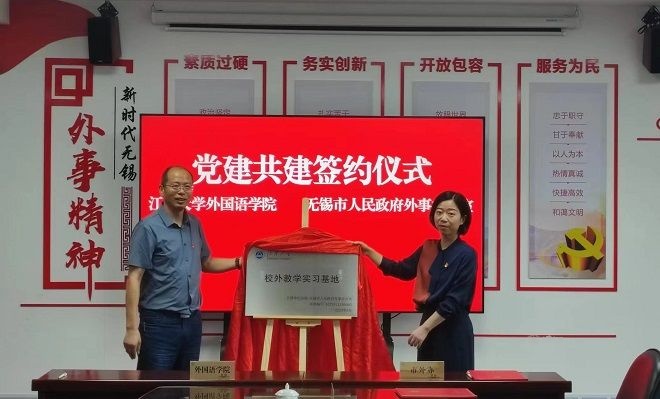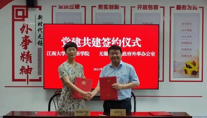 为充分发挥党建统筹引领作用,以高质量党建带动高质量发展,6月30日下午,外国语学院党委书记李荣华,党委副书记、副院长刘伯贤,英语系主任杨勇,英语系党支部委员吕洪波,辅导员顾海星一行赴无锡市政府外事办公室(市外办)举行党建共建签约仪式。市外办党组书记、主任詹熠,市外办党组成员、副主任叶诤,市外办涉外业务处长赵轶凡,市外事翻译中心党支部书记、主任许云云,欧盟项目创新中心(无锡)项目经理王晶,大公坊iMakerbase/雪创中心执行主任潘娜参加签约仪式。会议由市外办秘书处副处长蒋勇主持。