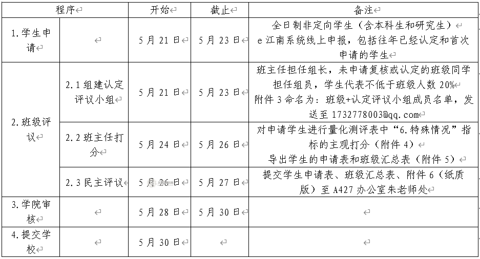 1. 以班级为单位成立认定评议小组,由班主任担任组长,未申请家庭经济困难学生认定的班级学生代表担任组员,学生代表人数不低于班级总人数的20%。评议小组成立后,填写附件3(命名为:班级+认定评议小组成员名单),5月23日17:00前将电子版发送至1732778003@qq.com。