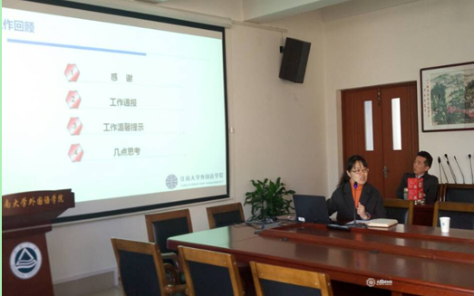 接着,赵副书记做了学院工作通报,三年来,我院逐步建立了SOL学分建设体系,树立外院品牌,开展优秀班风展示活动,促进国际交流的发展。从本科毕业生就业情况来看,我院本科毕业生就业率逐年攀升,超过全校平均水平。就业竞争力指数也逐年上升,得到社会各界的肯定。从海外交流情况,我院本科生海外交换、游学人数逐年增加,在本校排名位居前列,但相较同级其他学校外院的情况来看,我院仍需继续努力。从本科生专四、专八通过情况来看,我院专四、专八通过情况总体呈上升趋势,其中以2015年最为突出,专四优秀率达到新的高度。