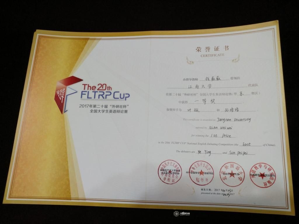 2017年4月21-23日,第二十届“外研社杯”全国大学生英语辩论赛华东赛区决赛在安徽大学圆满收官。全国大学生英语辩论赛由共青团中央学校部、全国学联秘书处、北京外国语大学主办,外语教学与研究出版社、中国教育电视台承办,是目前国内水平最高、影响最大的高校学生语言类竞赛。太阳城大学英语辩论代表队由外国语学院钱薇薇老师担任指导教师,英语专业孙培培和叶挺同学作为参赛选手组成。比赛现场,我校选手表现出扎实的语言能力和缜密的思辨思维,在五轮循环赛后居华东决赛区第六,最终获得一等奖。这是我校参加全国性英语辩论赛以来取得的最佳战绩。