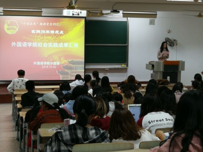 为引领广大青年学生践行习近平总书记系列重要讲话精神,凝聚青年学生坚定不移跟党走,引导学生勇做时代的开拓者、奉献者,外国语学院于2018年暑期组织了以“贯彻党的十九大精神·风正扬帆当有为”为主题的社会实践活动,为了使学生对活动有更深认识,10月30日晚上六点半,外国语学院于第二教学楼2D308教室开展了“实践归来话成长”暑期社会实践成果与经验分享报告会。外国语学院分团委书记杨艳、2018级辅导员黄颖及全体2018级新生参加了此次分享会。