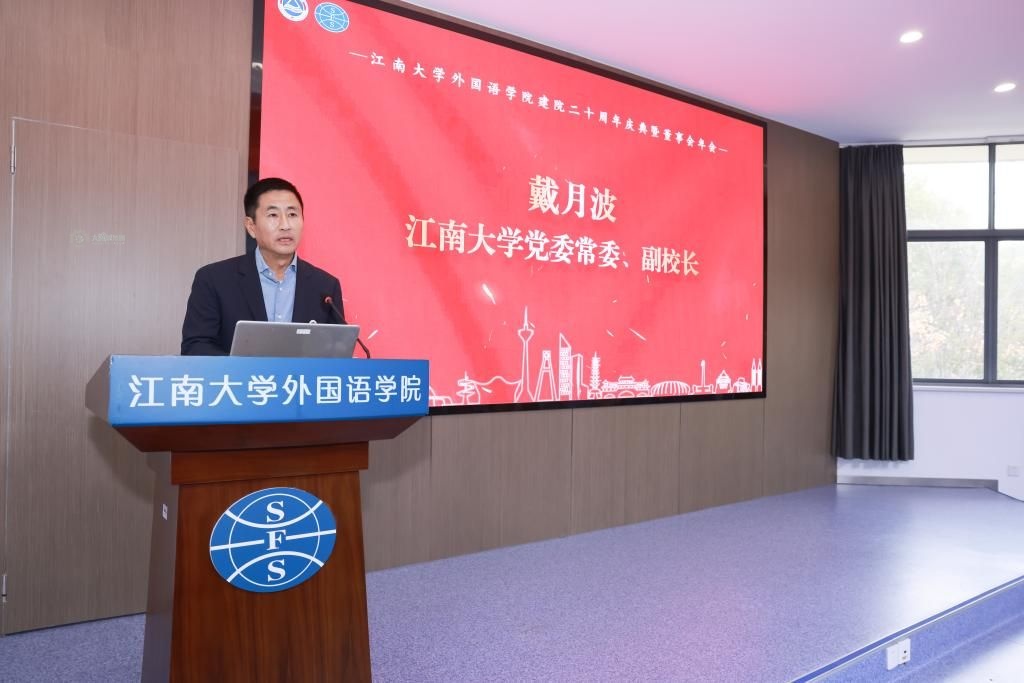 戴月波致辞,首先对外国语学院建院二十周年表示热烈祝贺。他高度肯定外国语学院建院二十年来始终坚守立德树人初心,秉承“融通文明,道弘天下”的院训,在学科建设、人才培养、科研创新、社会服务等领域取得了令人瞩目的成就,已成为学校国际化人才培养和中外文化交流的重要阵地。同时,向支持学校及学院发展的各界人士致谢并发出邀约,期待校友常回母校、董事单位持续支持学院发展,希望学院以建院二十周年为新起点,持续深化改革、锐意进取,在“外语+”交叉融合发展中打造特色品牌,为学校“双一流”建设和国家外语教育事业发展贡献更大力量。