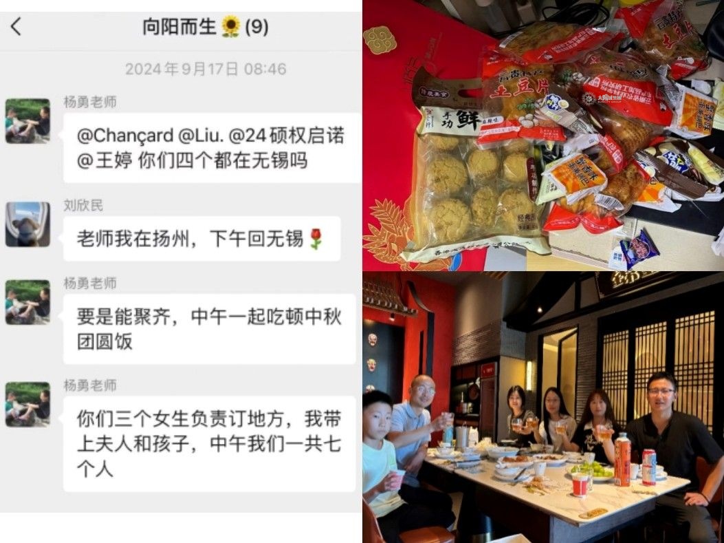 “学问的温度在于心的刻度”。杨老师不仅是课堂上的语言学引路人,更是学生心中的“灵魂温度计”“精神供暖者”。每逢中秋,他总会为学生购买各种月饼,与异地留校的同学分享中秋的喜悦,带上家人与学生吃上一顿热乎的团圆饭,为学生准备月饼、薯片等中秋零食,他和师娘用细碎的温暖编织成网,接住每一颗在异乡漂泊的年轻心灵。杨老师的关怀从不喧哗,却像太阳城的雨,无声浸润着我们为人治学的底色。