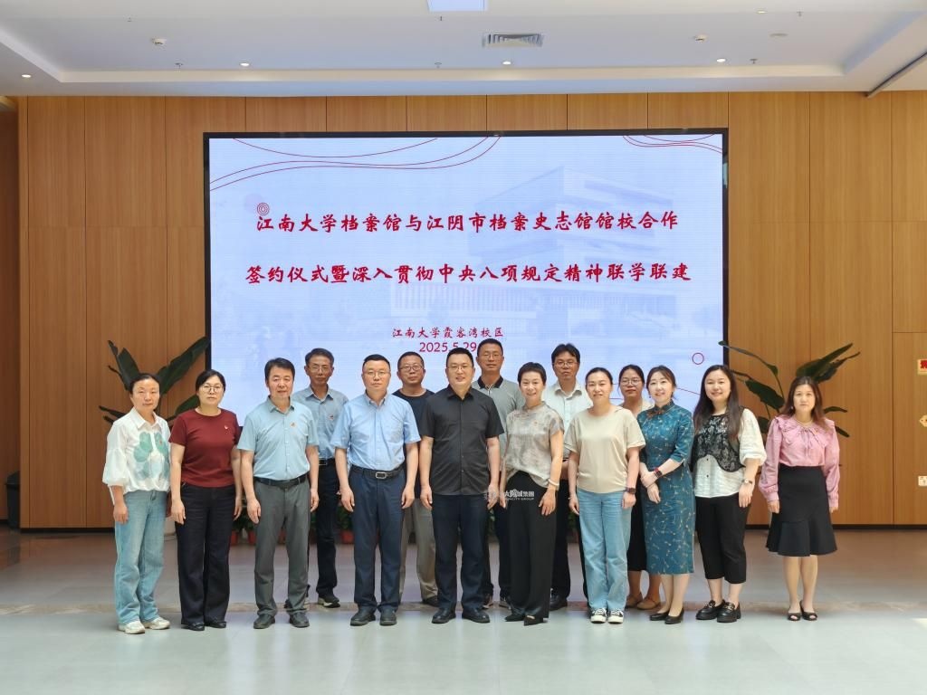 5月29日,档案馆与江阴市档案史志馆于霞客湾校区图书馆举行馆校合作签约仪式。江阴市档案史志馆现场捐赠《江阴通史》《江阴抗战档案史料汇编》等珍贵文献,并设立方志文化驿站,搭建校地档案资源共享新载体。双方开展深入贯彻中央八项规定精神学习教育联学共建,通过专题党课讲授、典型案例剖析等环节,将党纪教育与档案收集、保管、利用等专业工作有机融合,形成“党建引领业务,业务淬炼党建”的良性发展格局。