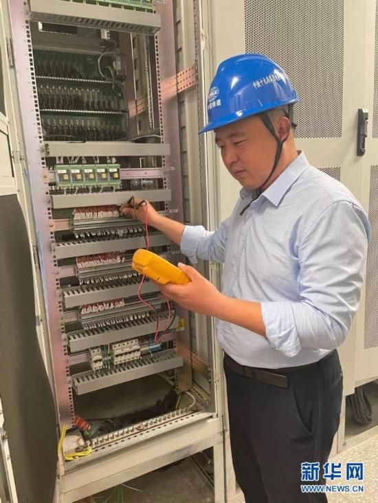 中铁十九局合肥地铁2号线项目经理房浩检测地铁配电机柜线路 (4月30日摄)。