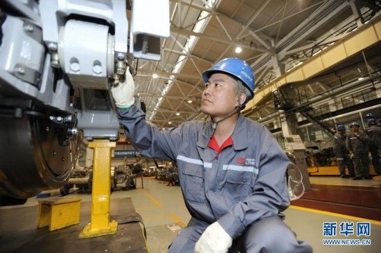 中车四方钳工宁允展在车间内检查机器(2017年5月摄)。