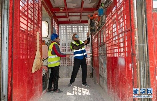 4月26日,中建三局北京丰台区小瓦窑项目机电设备负责人曾富国(右)在检查电梯防坠器。