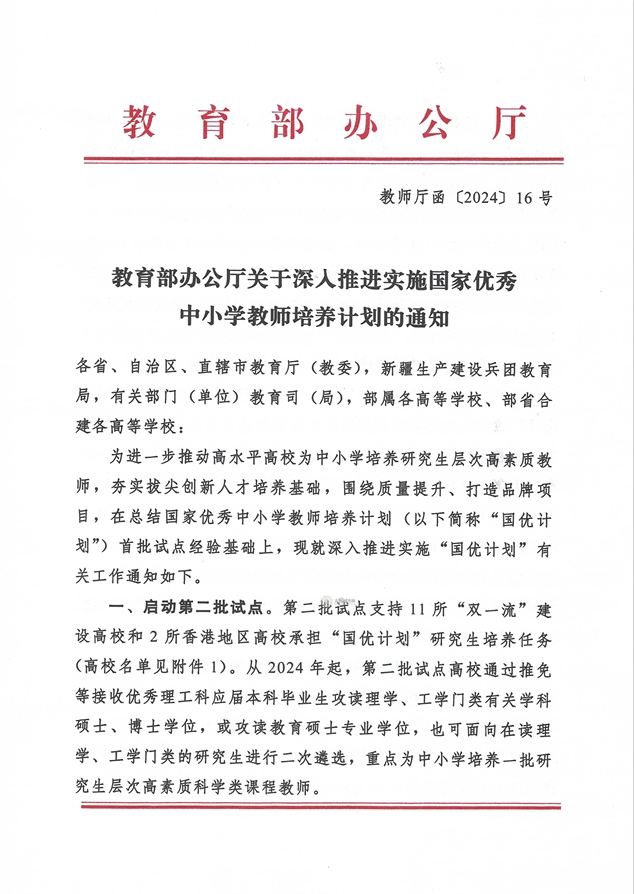 2023年起国家正式启动实施国优计划,支持以双一流建设高校为代表的高水平大学在理工类学科中选拔专业成绩优秀且乐教适教的学生作为国优计划研究生,吸引优秀人才从教,为中小学输送一批教育情怀深厚、专业素养卓越、教学基本功扎实的高素质科学类课程优秀教师。