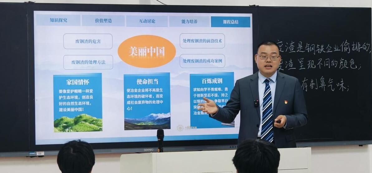 为了激发学生的学习兴趣和使命担当意识,他带领团队结合学校“钢铁是这样炼成的”育人体系,在以往教学实践和体悟基础上,进行“思政”和“思维”的双思交融,提出“双思交融、百炼铸魂”的教学模式。他带领大家挖掘时代元素建立课程思政案例库,打造“六味双思”课堂,以此强化思政引领。通过鲜活的国家安全思政案例让学生入耳入心,产生共鸣,铸出学生的“冶金报国”之魂。