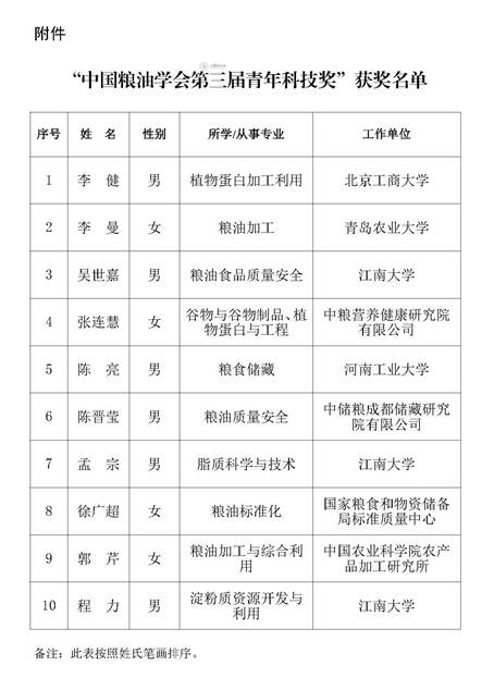 近日,中国粮油学会发布了《关于表彰中国粮油学会第三届青年科技奖获奖者的决定》(中粮油学发〔2022〕69号)。为进一步激发粮油青年科技工作者热情,造就粮油行业未来科研人才,中国粮油学会决定授予10名同志“中国粮油学会第三届青年科技奖”荣誉称号。其中我校3名食品学者入选,分别为食品学院吴世嘉、孟宗、程力。
