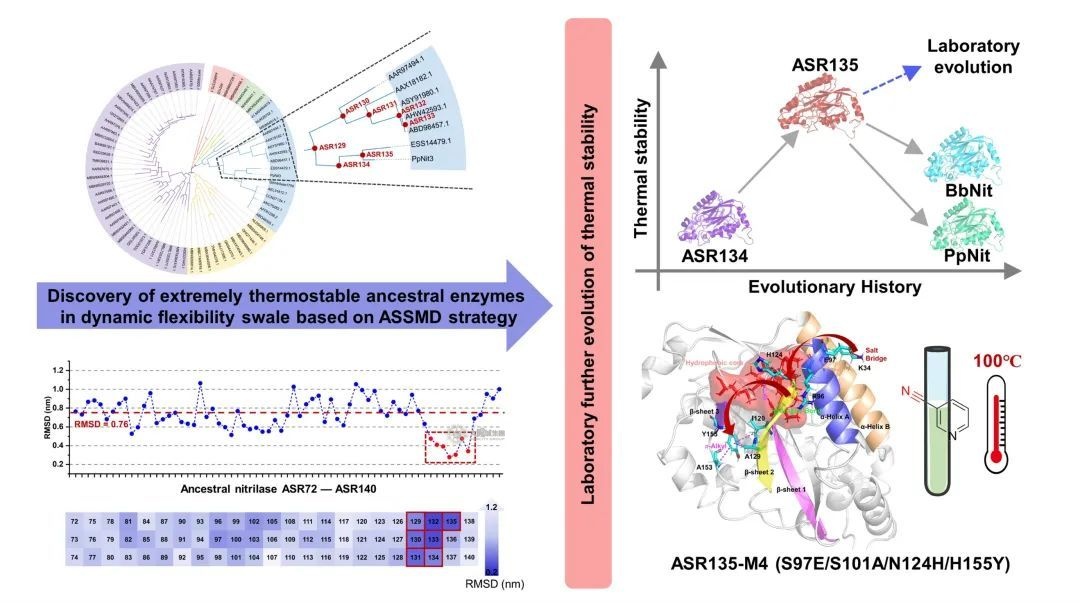 太阳城大学生命科学与健康工程学院史劲松教授课题组在极端嗜热祖先腈水解酶的挖掘与机制解析方面的研究工作取得重要进展。该研究成功通过祖先序列挖掘优化获得了一个全新的极端腈水解酶,其在沸水条件下的催化活性为腈水解酶在极端条件的生物催化应用开辟了新的可能。在此基础上相关技术体系的拓展可能催生出一批高性能、高稳定性的新型生物催化剂及组合,有望改变传统化学工业格局。