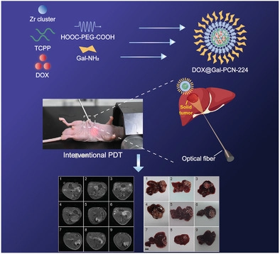 本项研究中,尹健团队将卟啉金属框架材料包封化疗药物阿霉素后,首次在材料表面修饰靶向分子半乳糖,利用半乳糖分子和肝癌细胞表面高表达的去唾液酸糖蛋白受体(ASGPR特异性的结合作用,将光敏剂卟啉和化疗药物阿霉素定向输送到病灶部位,起到靶向光动力学治疗和化疗协同治疗的效果。但是,由于光动力学治疗使用的光源组织穿透能力有限,光动力学治疗一般开发用于治疗浅表皮肿瘤,而不适用于深部肿瘤。针对上述问题,尹健团队首次发展了介入光动力学治疗,即在微创手术中利用光纤将光源引入到模型小鼠体内原位肝细胞癌表面,对深部肿瘤起到了显著的治疗作用,拓展了光动力学用于深部肿瘤的治疗,为癌症治疗提供了新的思路和策略。