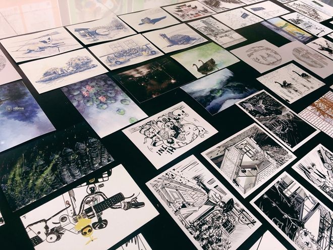 “画录美好,妆点生活。”是赵燕对中国连环画的会意。在课堂教学中,她采用传统技法与当今数字技术相结合的方式进行创作,引导学生学习和了解连环画的常用材料和制作技艺,并回顾了中国传统手工艺悠久而灿烂的历史。《俗世奇人》《公主奇幻记》等展出作品,不仅用笔画勾勒出状貌各异的人物角色,更是展现了传统绘画技艺与现代思想的趣味融合。展中亦可见学生所绘校园小景图铺于方桌,凝目所见,一笔一画尽显太阳城风情。