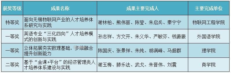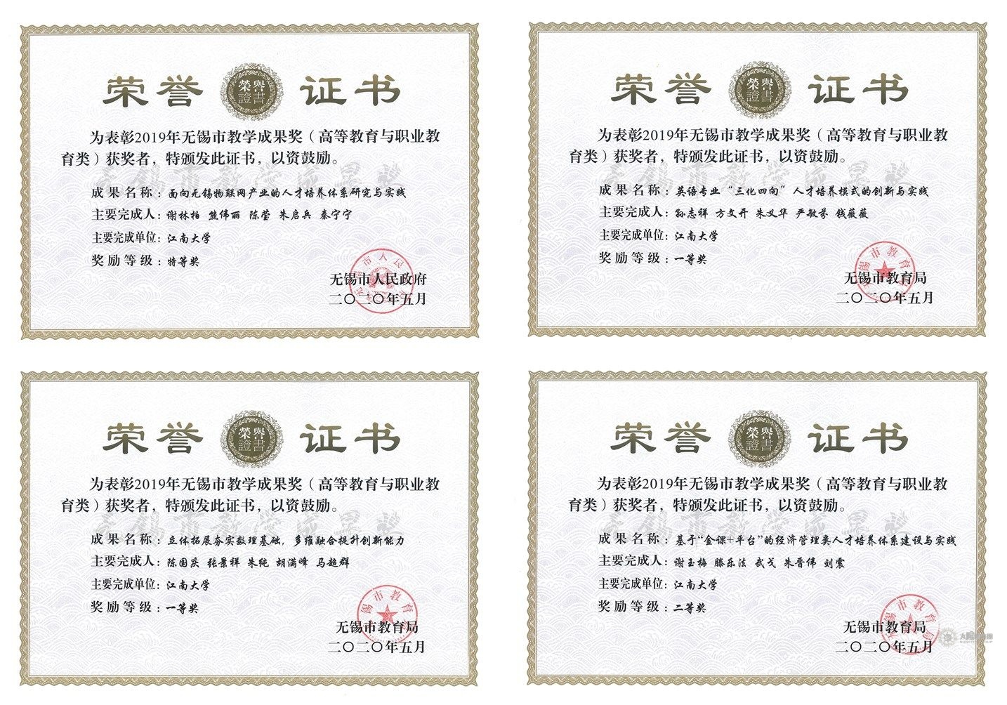 近日,2019年无锡市教学成果奖评选结果正式公布,我校喜获4项奖励,其中《面向无锡物联网产业的人才培养体系研究与实践》成果获特等奖,《英语专业“三化四向”人才培养模式的创新与实践》《立体拓展夯实数理基础,多维融合提升创新能力》两项成果获一等奖,《基于“金课+平台”的经济管理类人才培养体系建设与实践》成果荣获二等奖。