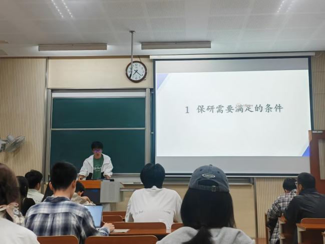 本次分享会邀请了光科21级的李炳涛、白洋、田高雯三位优秀学子,他们凭借卓越的表现成功分别保研至浙江大学、中国科学技术大学、北京理工大学。在交流会上,三位同学毫无保留地分享了自己的保研心得与成功经验。李炳涛以其丰富的夏令营经历为切入点,详细阐述了参加夏令营的全过程,并着重介绍了面试环节中的注意事项与应对策略。他的分享,让在场的同学们对夏令营有了更深入的了解,也激发了他们参与夏令营的热情。白洋则着重强调了保研所需满足的各类条件,如学科竞赛、科研项目、论文发表等。他结合自己的亲身经历,为同学们提供了宝贵的建议,鼓励他们积极参与各类活动,提升自己的综合素质。田高雯分享了保研前期准备工作的心得,以及在选学校、联系导师等方面的经验。她详细介绍了如何制定科学的备考计划,如何选择合适的学校和专业,以及在与导师沟通时的技巧与注意事项。她的分享,让同学们在保研的道路上少走了许多弯路。在互动环节,现场的学生们积极举手提问,就学习方法、专业选择、职业规划等方面的问题向学长学姐们请教。三位优秀学子耐心解答,用生动的例子和亲切的语言,为同学们提供了实用的建议和指导。现场气氛热烈而融洽,同学们纷纷表示受益匪浅。