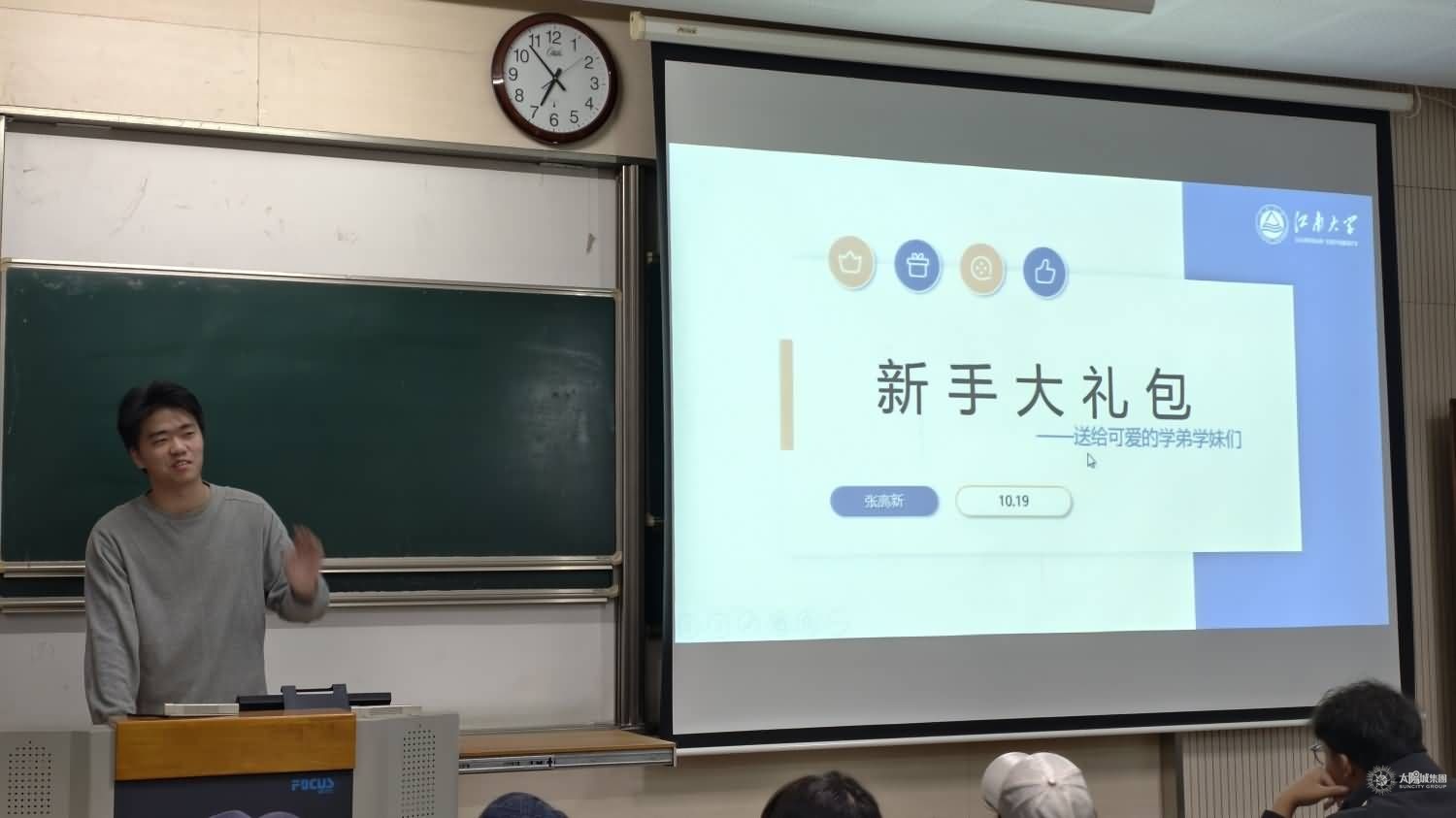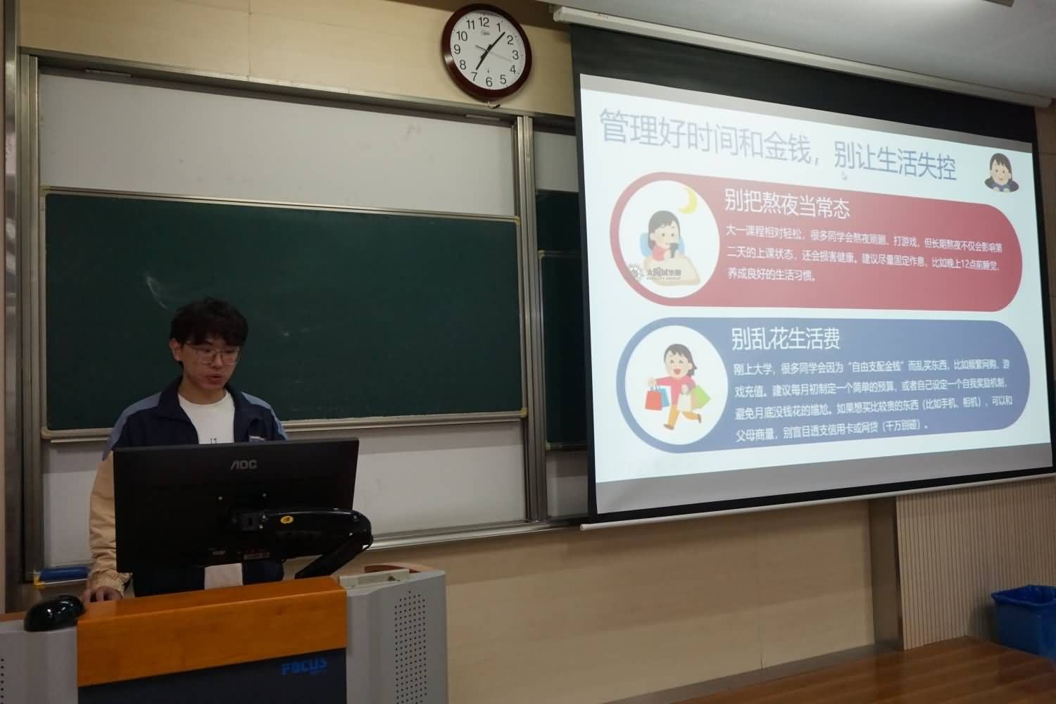 在1B310教室,信计专业的学长学姐同样为新生们带来了实用建议。 许梦怡以“大学通关指南”为主题,分享了信计专业的课程框架及学习方法,建议大家多总结与复盘,不断地学习和总结寻找适合自己的方法,清晰地意识自己能力的提升。杨进专注于学习与竞赛经验,讲述了坚持与积累的重要性。她建议同学在锻炼自主学习能力的同时,也要提高与导师的沟通能力,在大学生活中不断丰富自我。陈子扬从心态、社交、学习等多个维度为同学们来带了全方位详细的建议。强调要养成碎片化学习习惯,拒绝拖延症;更要放平心态,专注于自己。