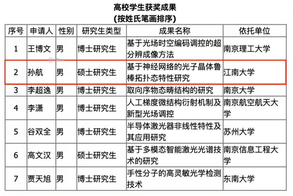 近日,江苏省光学学会公布第十一届“江苏省光学学会青年光学科技奖”评选结果。理学院光学工程专业2023级硕士研究生孙航凭借研究成果“基于神经网络的光子晶体鲁棒拓扑态特性研究”荣获“高校学生类”奖项。