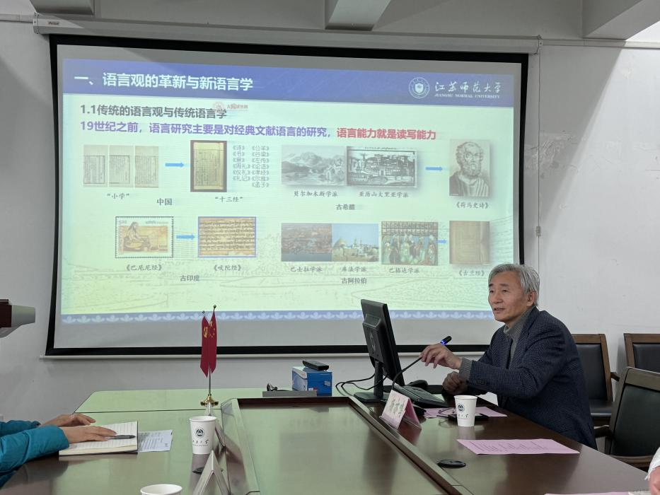 随后,杨亦鸣教授按照历史脉络梳理了语言观的历史演进和当代变革,特别对乔姆斯基的转换生成语法理论进行了客观评价,并就转换生成语法对现代语言神经科学的引领作用做出了详细说明。此外,杨教授还结合江苏师范大学语言神经科学研究团队近年来所发表的主要成果向与会老师和同学们阐释了语言不仅是国家文化软实力的体现,更是科技硬实力的重要表征。