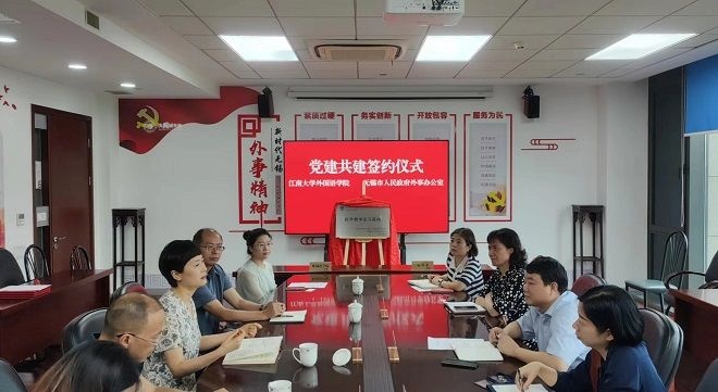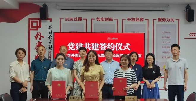 为充分发挥党建统筹引领作用,以高质量党建带动高质量发展,6月30日下午,外国语学院党委书记李荣华,党委副书记、副院长刘伯贤,英语系主任杨勇,英语系党支部委员吕洪波,辅导员顾海星一行赴无锡市政府外事办公室(市外办)举行党建共建签约仪式。市外办党组书记、主任詹熠,市外办党组成员、副主任叶诤,市外办涉外业务处长赵轶凡,市外事翻译中心党支部书记、主任许云云,欧盟项目创新中心(无锡)项目经理王晶,大公坊iMakerbase/雪创中心执行主任潘娜参加签约仪式。会议由市外办秘书处副处长蒋勇主持。