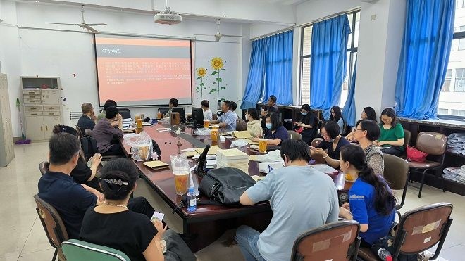 为深入贯彻落实党的二十大精神,全面推动习近平新时代中国特色社会主义思想进教材、进课堂、进头脑,英语系组织全体教师研读双语版二十大报告,就“二十大报告精神和思政元素如何融入课程”开展了交流研讨。
