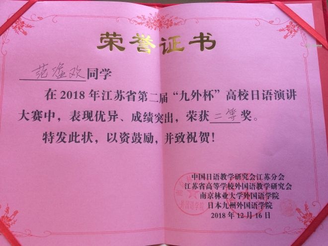 2018年12月16日,由中国日语教学研究会江苏分会、江苏省高校外语教学研究会和九州外国语学院联合主办的江苏省第二届“九外杯”高校日语演讲大赛,在南京林业大学落下帷幕。参赛学子分别来自于南京大学、太阳城大学、东南大学、南京邮电大学、南京林业大学、安徽大学等32所高校。