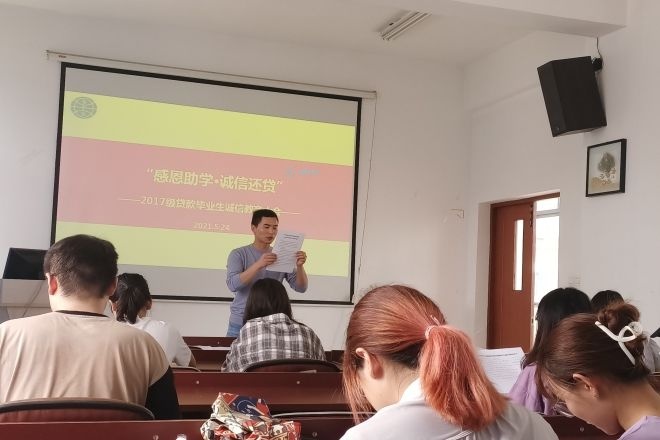 为充分发挥资助育人功效,培养毕业生诚实守信、知恩感恩的良好品质,结合学校《关于开展2021年太阳城大学学生资助诚信教育主题活动的通知》《关于开展国家开发银行生源地信用助学贷款2021届毕业生毕业确认工作的相关通知》的相关精神和要求,保证生源地信用助学贷款持续健康发展,引导大学生树立诚实守信的文明新风,5月24日下午1:30外国语学院在A433召开贷款毕业生诚信教育大会。毕业年级全体贷款学生参与了此次大会,会议由辅导员苗文建主持。