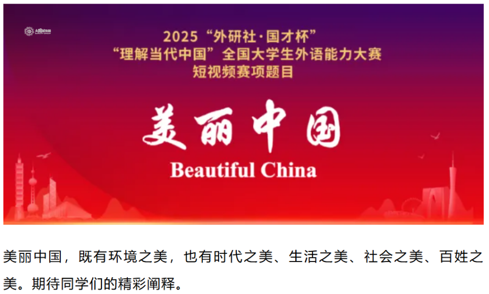 参赛方式:参赛选手围绕本年度比赛主题“美丽中国”制作原创短视频,视频时长3—5分钟,配中英双语字幕。