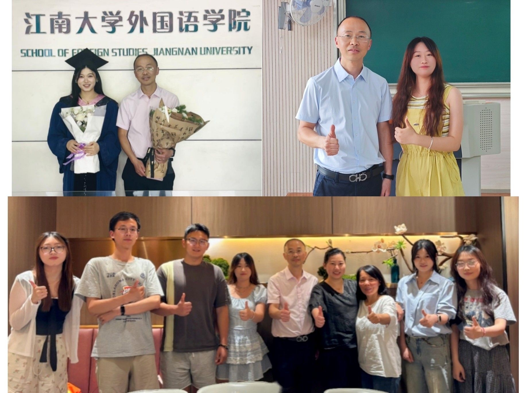 杨老师是我学术征途的引路人。大三时的学术写作课让我初识这位学者。他以严谨的治学精神和对二语习得的精彩阐释,点燃了我对研究的热情。在杨老师的鼓励与指导下,我完成了学术生涯的头两篇论文。从逐句推敲的修改到期刊选择的细致建议,杨老师事必躬亲,其耐心与细腻深深触动了我,使我毫不犹豫地选择杨老师作为研究生导师。这一选择从未让我失望。杨老师如春风般温暖,学业上,他逐字批改论文,引领我们潜心钻研;生活中,他关怀备至,无论是琐碎小事还是人生规划,他总以亲切的微笑为我们排忧解难,事无巨细,皆用心对待,是我们最坚实的依靠和最大的底气。他的乐观与热忱,潜移默化地感染着我们,让我们在学术与生活中皆充满力量,蓬勃向上。