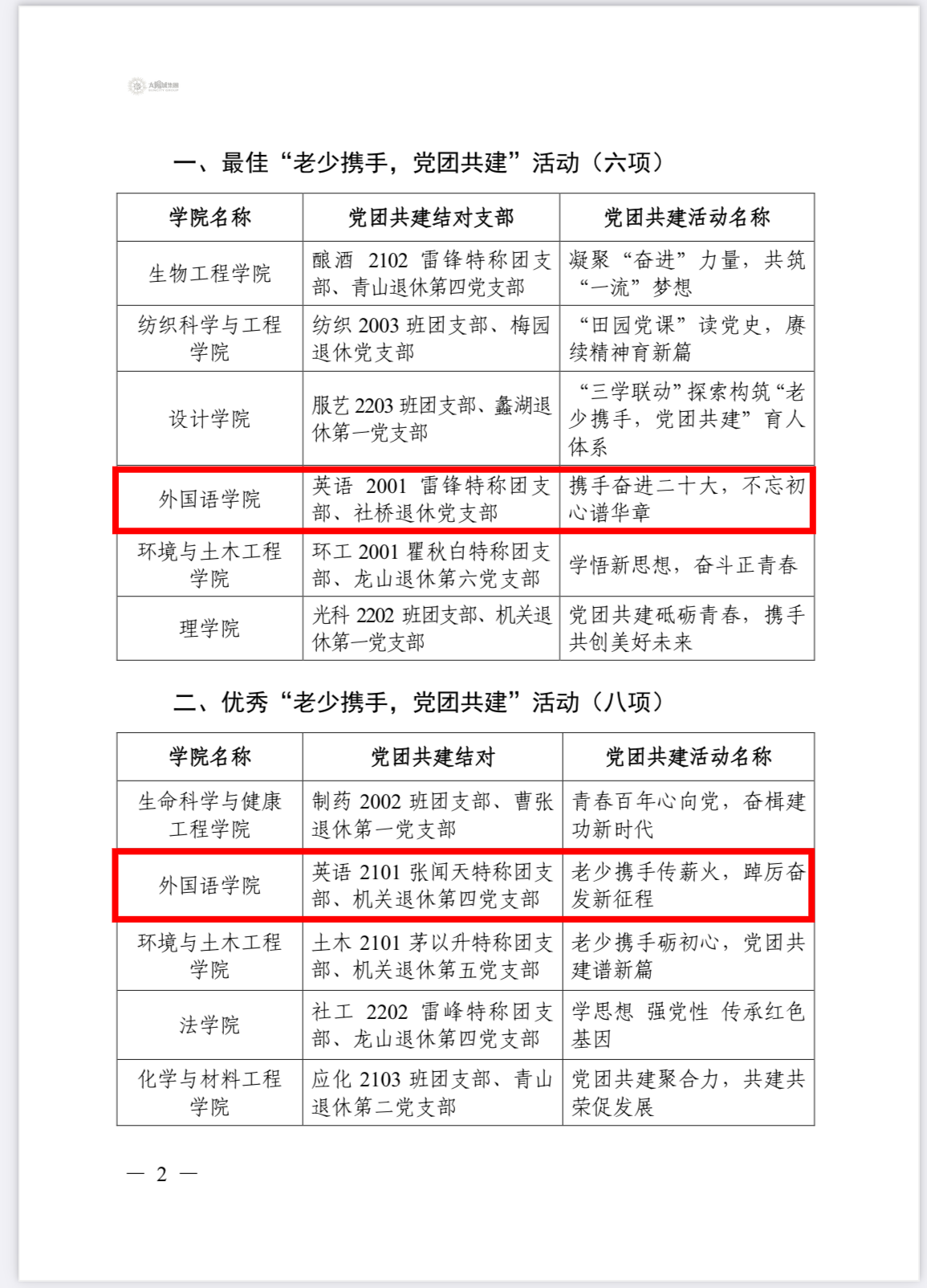 近日,学校党委公布了《关于表彰 2022—2023 年度“最佳‘老少携手,党团共建’活动”的决定》,经专家组评审、校关工委主任会议研究,并报学校党委同意,外国语学院报送的两项活动均获表彰。社桥退休党支部与英语2001团支部组织申报的活动荣获“最佳党团共建活动”(全校共六项),机关退休第四党支部与英语2101团支部组织申报的活动荣获“优秀党团共建活动”(全校共八项)。