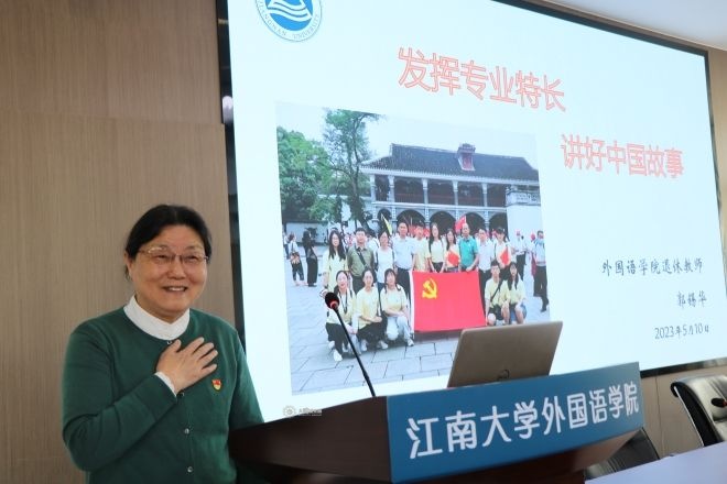 开班仪式后,由关工委委员郭锡华老师为学员带来专题第一讲《发挥专业特长,讲好中国故事》。郭老师结合习近平总书记给青年的寄语,分享了外国语学院近年内发挥专业所长进行文化交流、讲好中国故事的实例。接着,又针对外语类专业适应社会发展的需要指明新文科背景下外语专业发展方向,提出抓专业质量的要求:一、优化专业结构;二、抓好质量标准;三、具备国际视野。郭老师鼓励学员们要树立远大理想,担当时代责任,与时俱进,锤炼自身能力,让青春在不断奉献中焕发光彩。